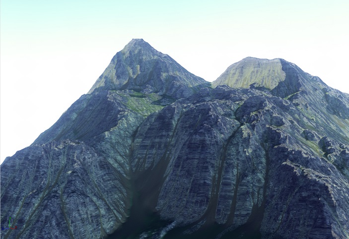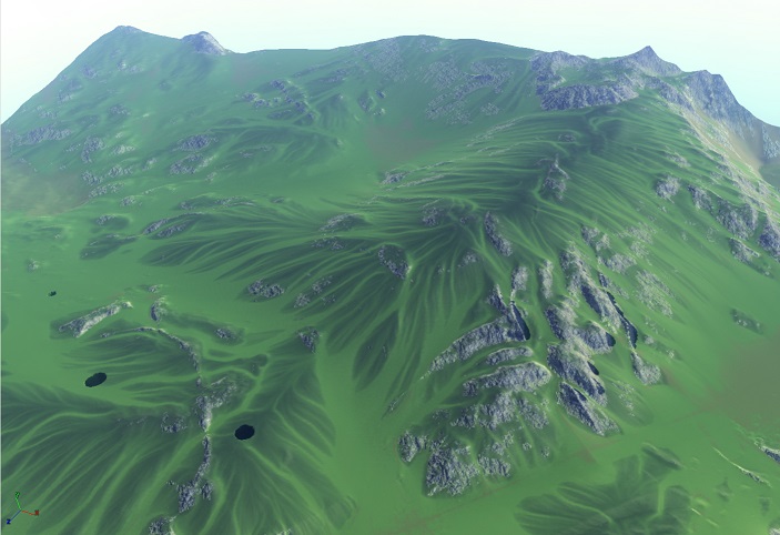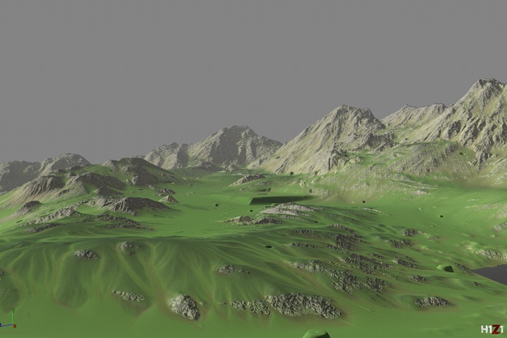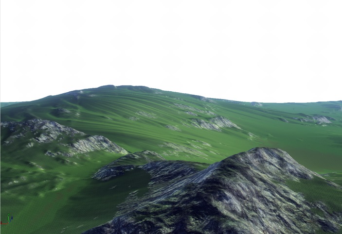 “At this point in the process, the terrain geometry has been generated based on Design's needs for game play. The mountains, internal hills, and valleys are formed to connect the towns and locations on the map. In these shots, we're establishing height/slope rules to ensure rock only appears where rock would be exposed naturally, breaking into rubble at its base and transitioning into grassy fields and dirt in the depressions. A zone-wide mask has to be made for each texture used. Afterwards, a coverage map will be generated to help add color variety and depth to the textures on the terrain. This will give cavities more darkness, rocky peaks a sun bleached quality, and scatter some yellow and green in the fields to help the grass have a natural patchy look rather than being uniformly lush. The mountains along the perimeter of the zone will then get snow-capped peaks and the water bodies their rocky riverbeds.”